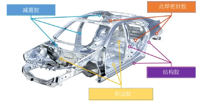 (1)车身上受空间局限、无法进行点焊施工的钢板焊缝区域,可以用点焊结构胶粘接取代焊接,这些区域一般包括: