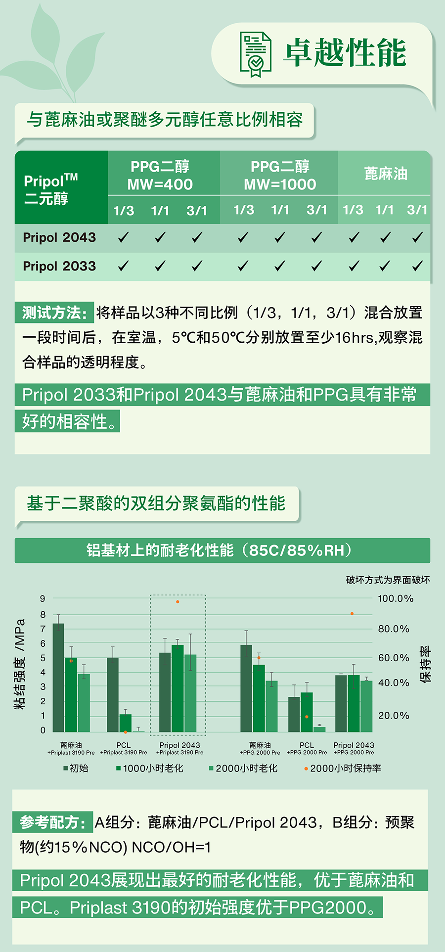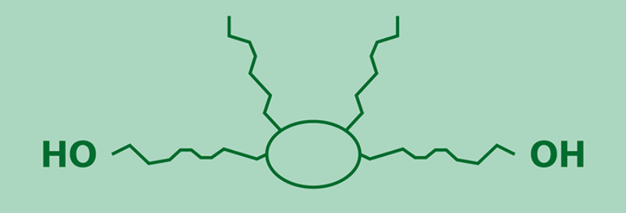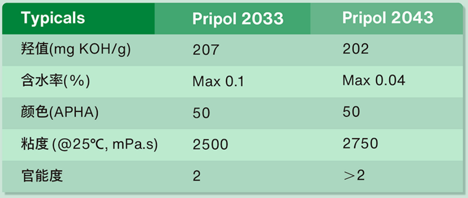Pripolrm™2033和Pripolm™ 2043是100%的生物基多元醇,本体结构含有36个碳,其长链脂肪烃结构提供较低的玻璃化转变温度和较好的柔韧性;含有两条脂肪族侧链,能够有效的抑制结晶;结构中不含有任何醚键和酯键,具有较好的疏水性,和耐水解性等耐老化性能。