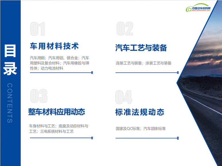 【汽车材料】汽车行业作为科技进步与产业升级的先锋,其每一步发展都牵动着全球经济的脉搏。汽车材料与制造工艺作为汽车技术创新的基石,不仅关乎车辆的性能、安全、环保,更是推动汽车产业转型升级的关键力量。为了便于广大读者查看汽车材料与制造工艺领域的新闻动态,中国汽车材料网自2024年7月起,正式推出《汽车材料新闻月报》。《月报》将精心筛选的国内外汽车行业材料技术、工艺装备、整车应用及标准法规四个方面的资讯呈现给广大读者,希望通过持续分享这些有价值的信息,能够激发行业内外的创新思维,促进技术交流与合作,共同推动汽车行业的进步和发展。