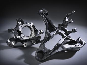 底盘部件材料将展出高强度、高韧性球墨铸铁“NMS”。NMS的低温靭性和尺寸精度高,适用于悬挂、差动齿轮、转向节部件等。可进行近净成型,有助于实现薄壁化和轻量化。